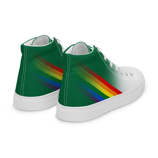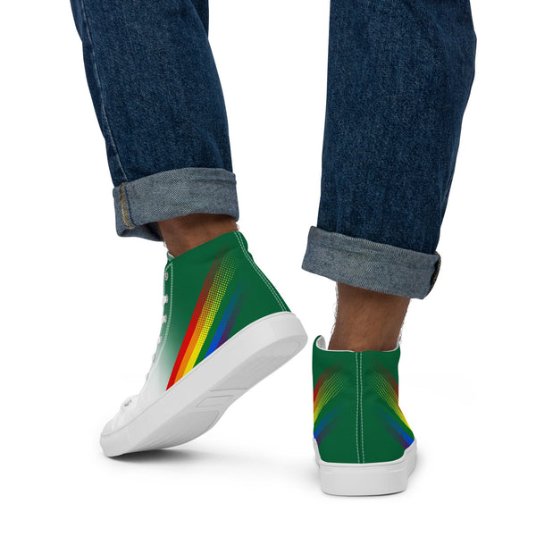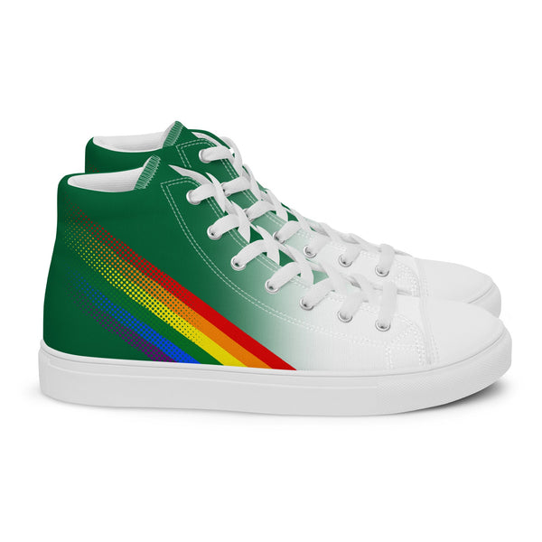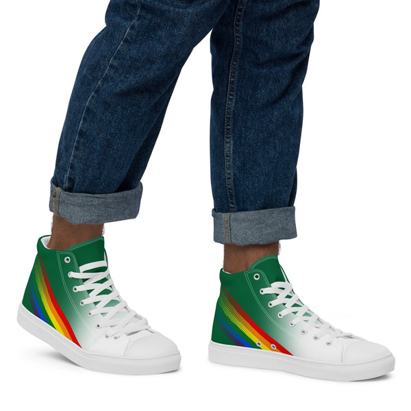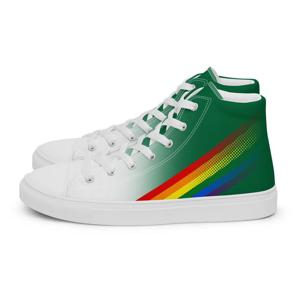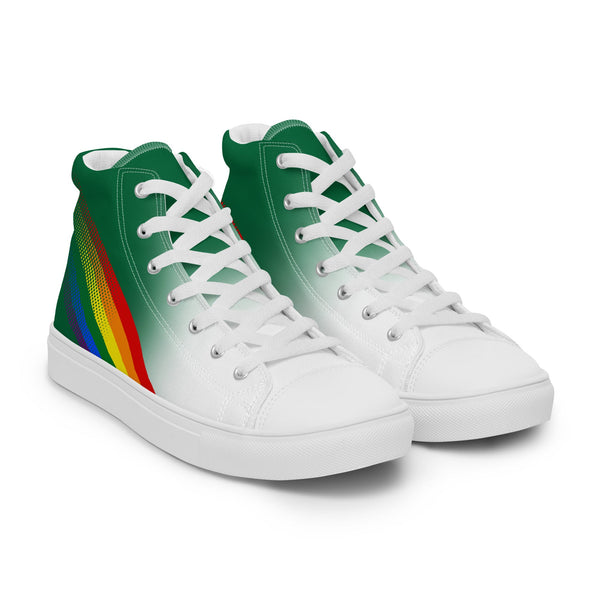 Celebrate individuality with these Green Gay Pride High Top Sneakers with Rainbow Flag Design. Featuring a clean fade from white to vibrant green, these shoes offer a fresh take on classic high tops. The side panels are detailed with bold rainbow pride flags, adding a powerful and colorful message of LGBTQ+ visibility.