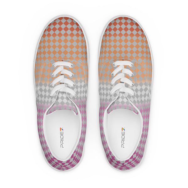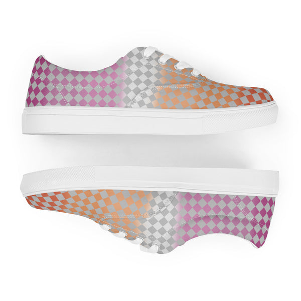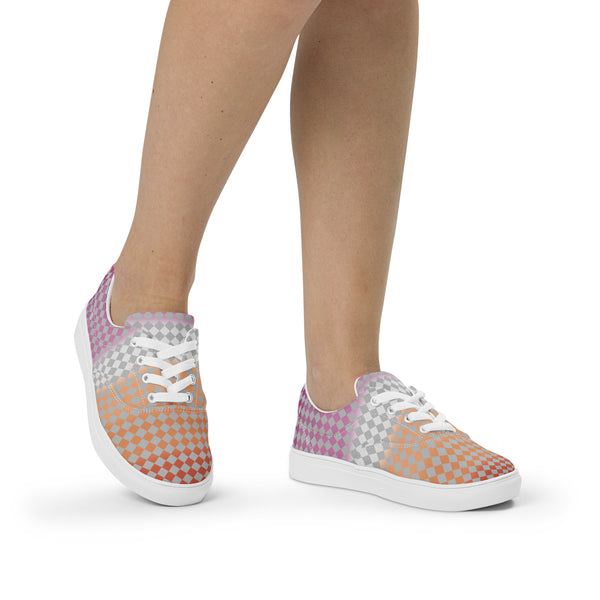 Be fierce and fashionable with these Gray Checkerboard Lesbian Pride Lace-Up Shoes, featuring a sleek gray checkered pattern and the vibrant colors of the lesbian flag. Designed for comfort and style, they let you walk with confidence while making a bold statement of love, equality, and pride.
