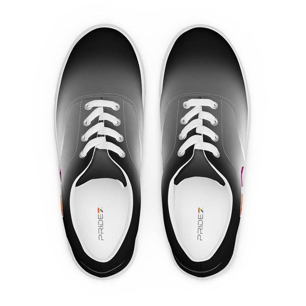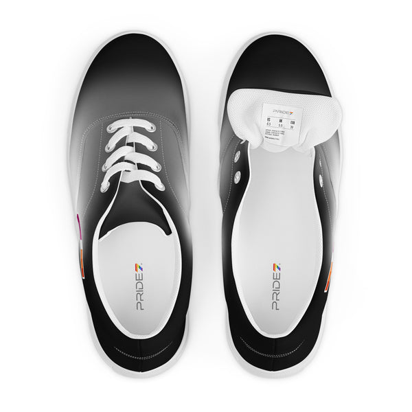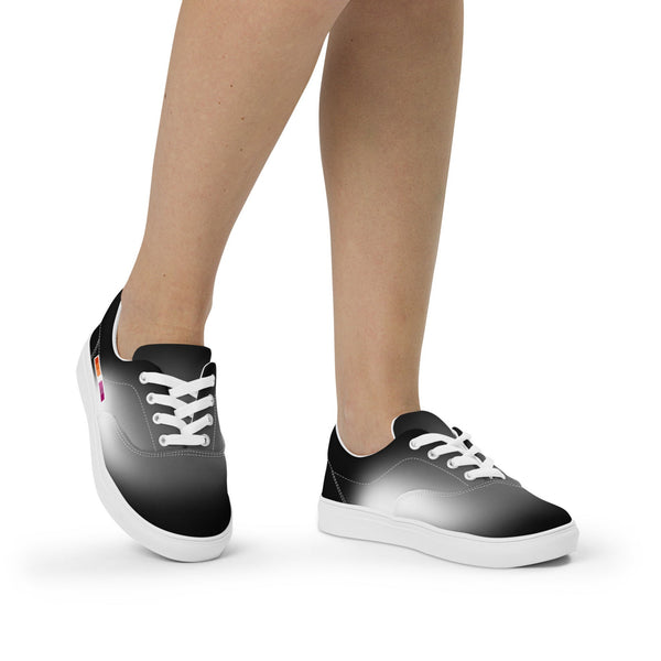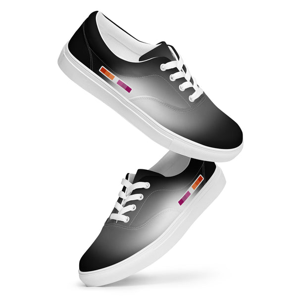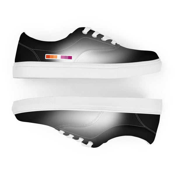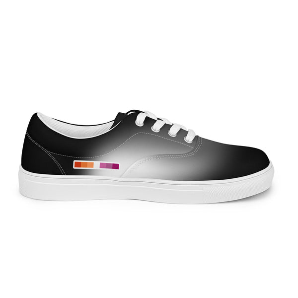 Step out in style with these Gray Fade Lesbian Flag Lace-Up Shoes, featuring a sleek gray, black, and white gradient with subtle accents of the iconic lesbian flag. Perfect for everyday wear, they blend comfort, versatility, and pride, making them a must-have for expressing identity with any outfit.