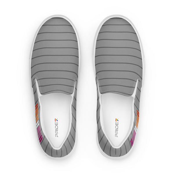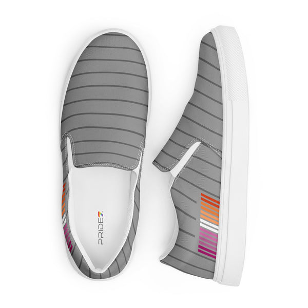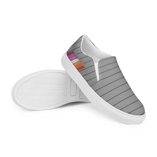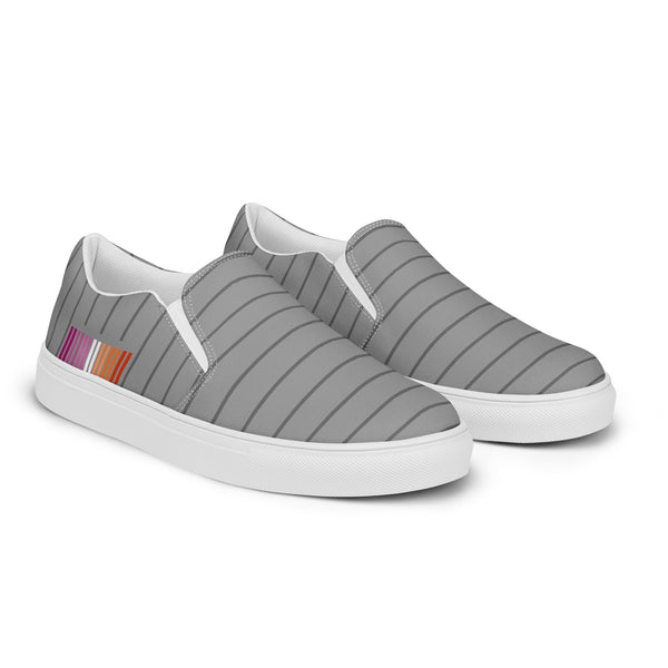 Walk with pride in classic gray slip-on shoes featuring light and dark wide pinstripes inspired by the lesbian flag. Combining comfort with timeless style, they’re perfect for daily wear or pride events. Make a subtle yet powerful statement while supporting the LGBTQ+ community.
