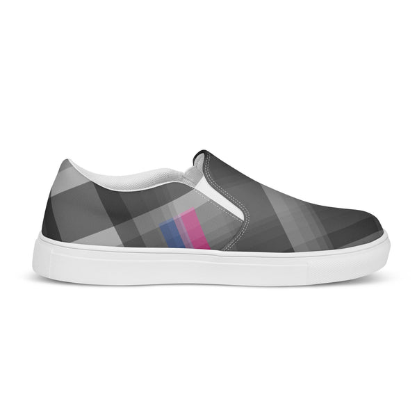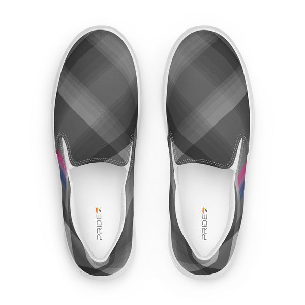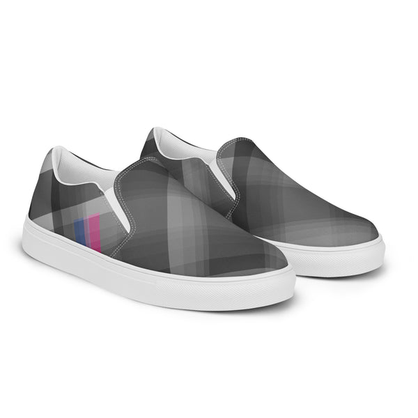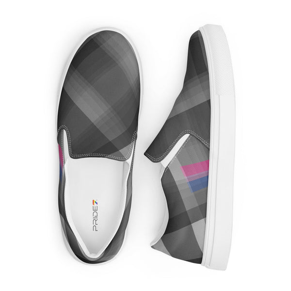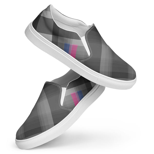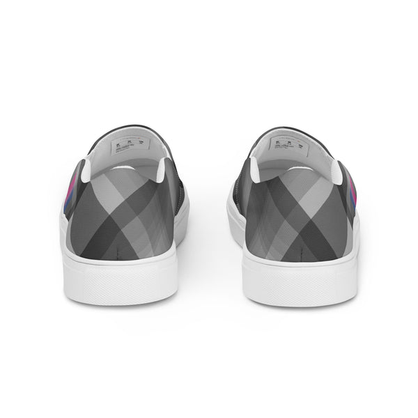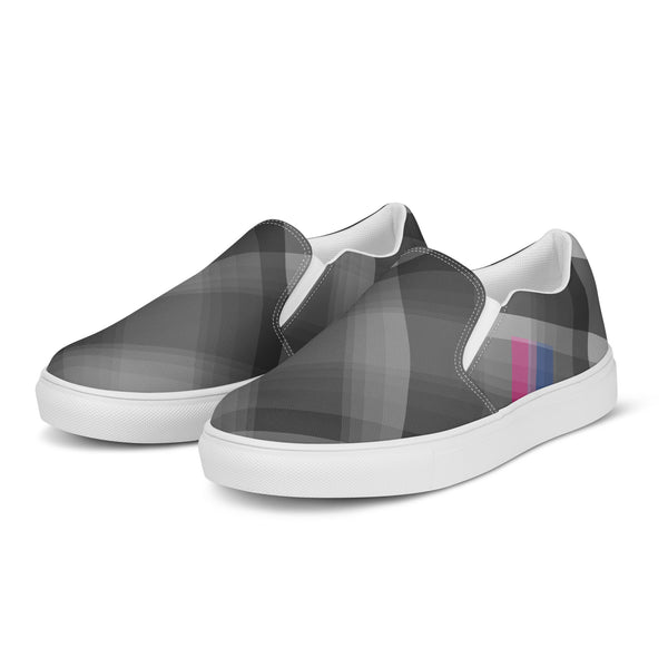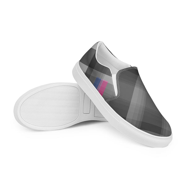 Slip into style and subtle pride with these gray plaid loafers featuring accents inspired by the bisexual pride flag. Designed for comfort and everyday wear, they blend fashion-forward detail with quiet LGBTQ+ representation. Celebrate love, identity, and diversity in a pair that speaks volumes without saying a word.