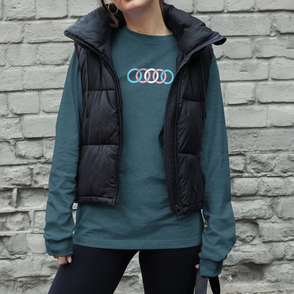 Celebrate pride and unity with the Trans Pride Interlocking Circles Long Sleeve Shirt. Featuring bold, overlapping circles in vibrant trans flag colors across the chest, this eye-catching design symbolizes connection, identity, and support. Crafted for everyday comfort and visibility, it’s the perfect piece to show your pride and solidarity with style, confidence, and purpose -- wherever life takes you.