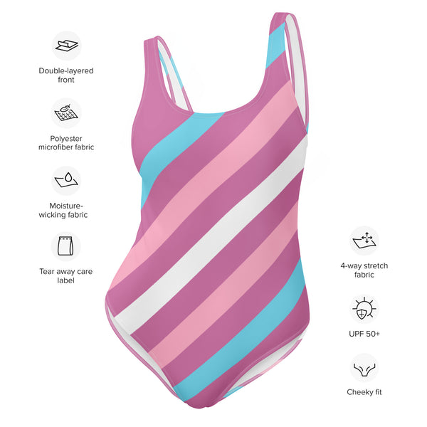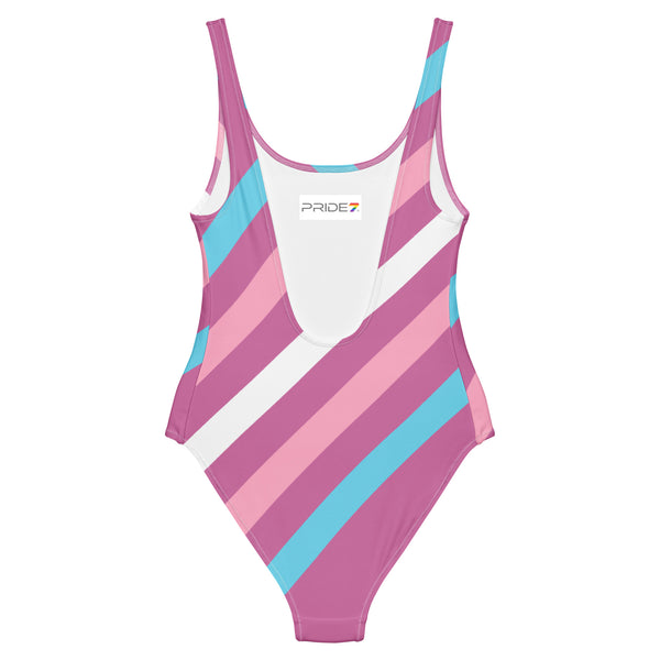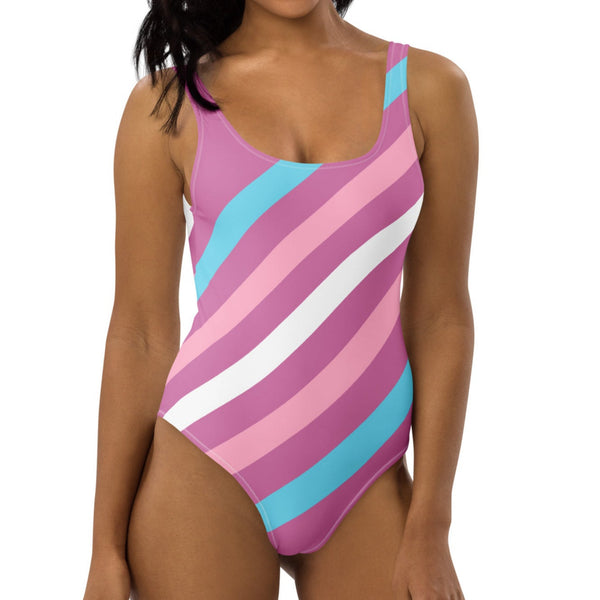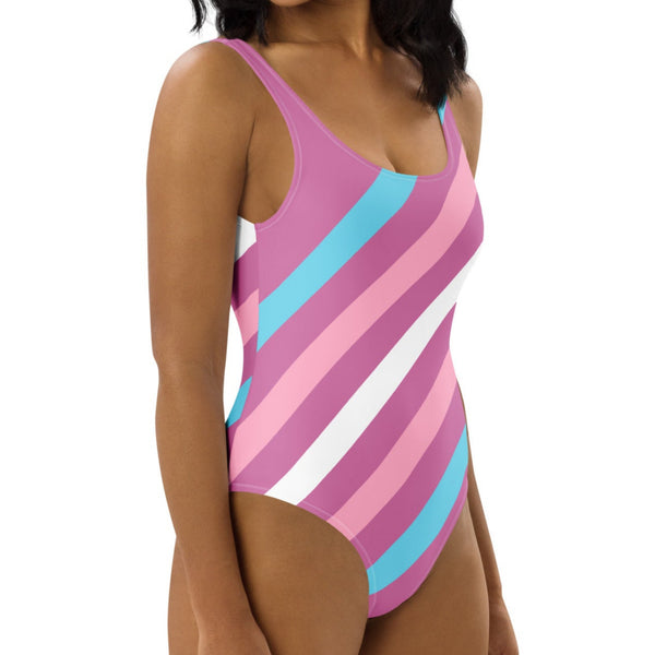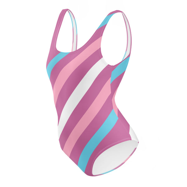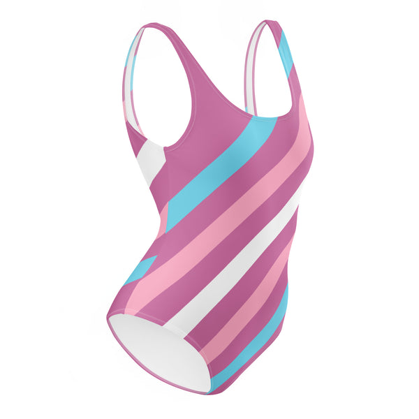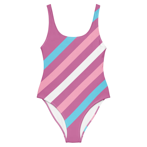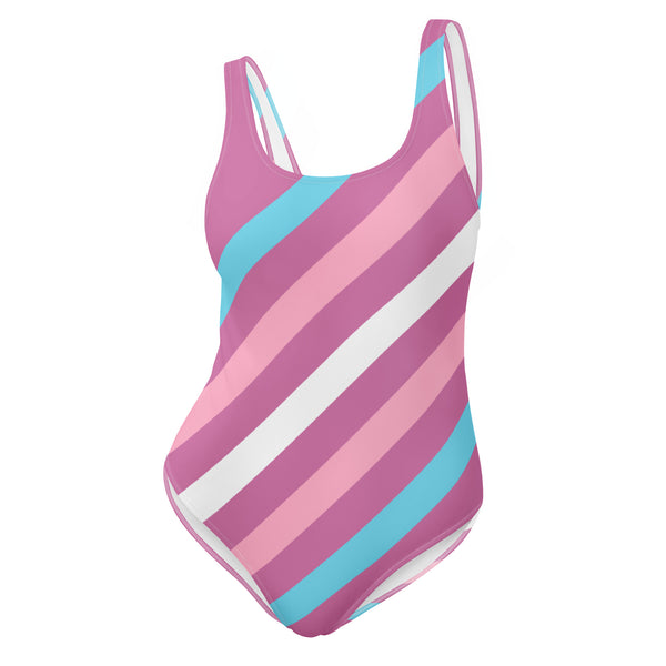 Celebrate your pride in this striking mauve one-piece swimsuit featuring bold diagonal stripes inspired by the transgender pride flag. Designed for comfort and confidence, this suit offers a flattering fit that moves with you. Whether you're at the beach, pool, or Pride celebration, this bold design empowers you to express your identity with pride and style.