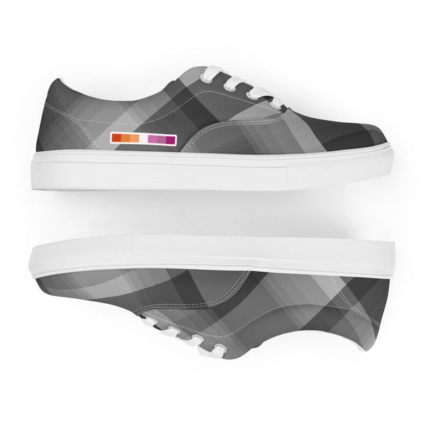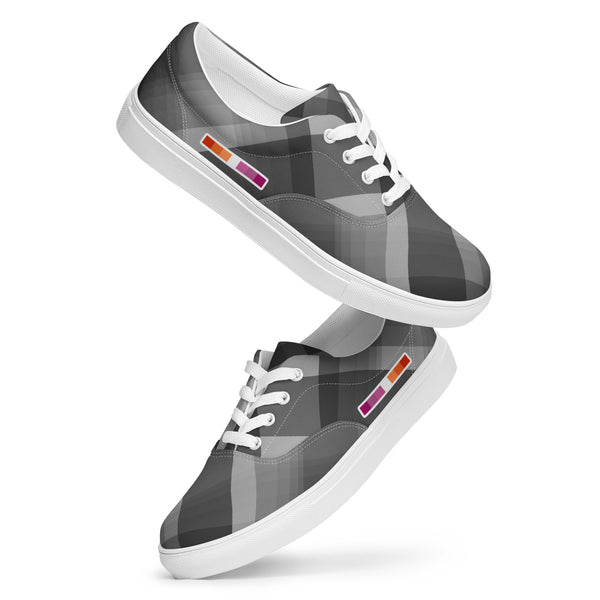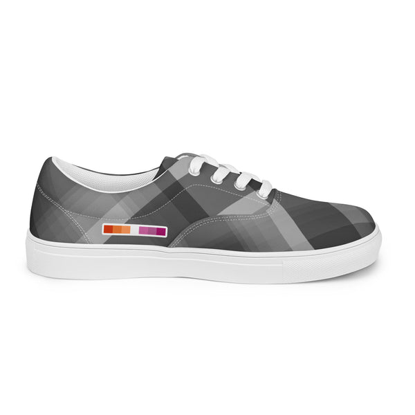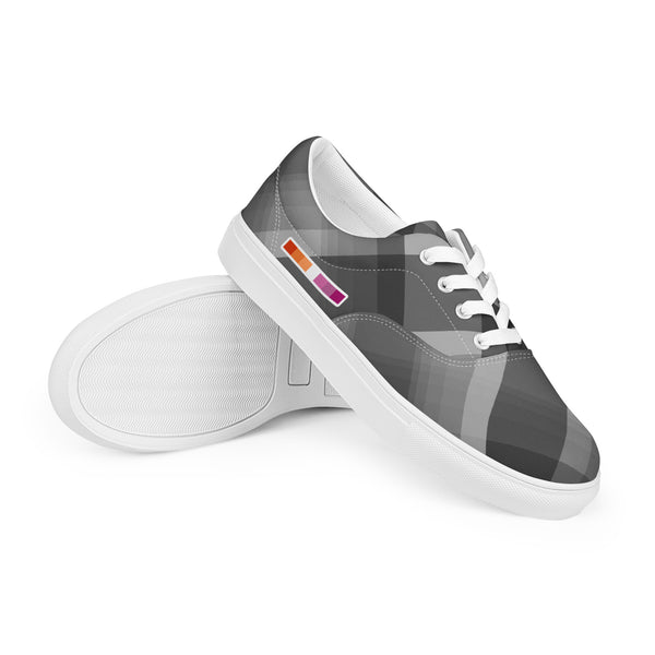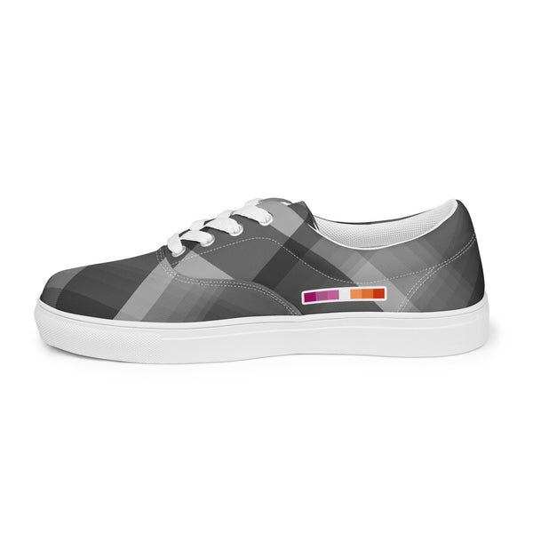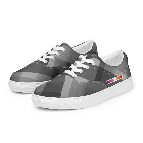 Add flair to your footwear with these Gray Plaid Pattern Lesbian Pride Lace-Up Shoes, featuring an all-over plaid design and subtle flag accents. Perfect for adding a playful edge to any outfit, they blend comfort, style, and pride so you can show your individuality with every step.